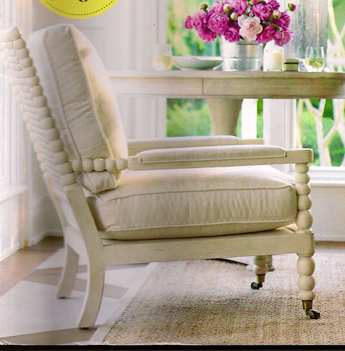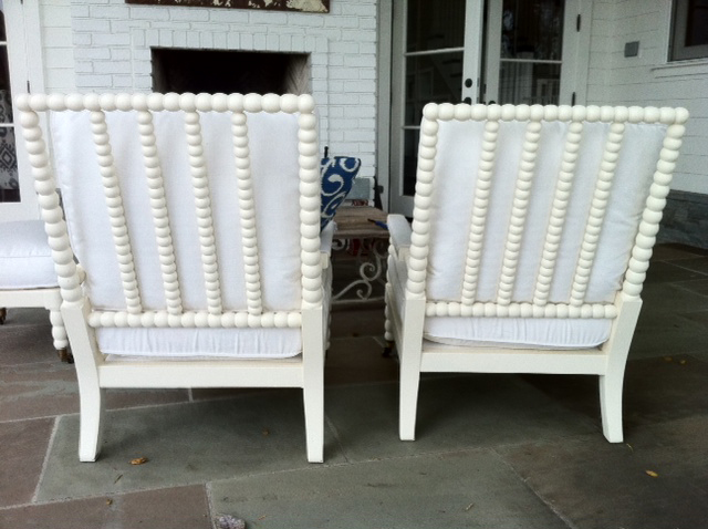 It all started with this pic from House Beautiful. My client, who LOVES classic design, and tons and tons of WHITE, was looking for outdoor furniture but was disappointed with what everyone had to offer. I loved this spool chair from the get-go and was figuring out how to use it in her home. Why not take it outside under the covered patio with some outdoor fabric? BINGO! She loved it! Loved it so much in fact that we custom designed some pool loungers too. Never seen anything like them… and not sure if we ever will again, unless we make more ;). In the meantime… I’ve become a fool for spool…